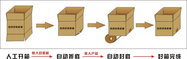 該款SCGPK-40S半自動折底封底機設備體積輕巧,重型自帶剎車腳輪相輔,移動極其靈活,不需調試,只要紙箱規格符合使用范圍便可直接使用。使用方法:人工將紙箱撐開,手動將紙箱底部兩片紙板折下,放至半自動封底機上面(左右擺下即可折下),當紙箱觸碰到半自動封底機的開關后,設備會自動將紙箱另外兩片紙板自動折起來,這時候紙箱是靜止不動的,您可以往紙箱里面放入包裝物,然后再踩一下腳踏開關,設備的氣動推料部件,便會自動將紙箱推動進行自動封底,封完后即可搬下紙箱。