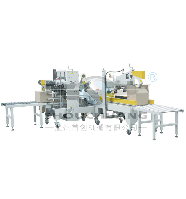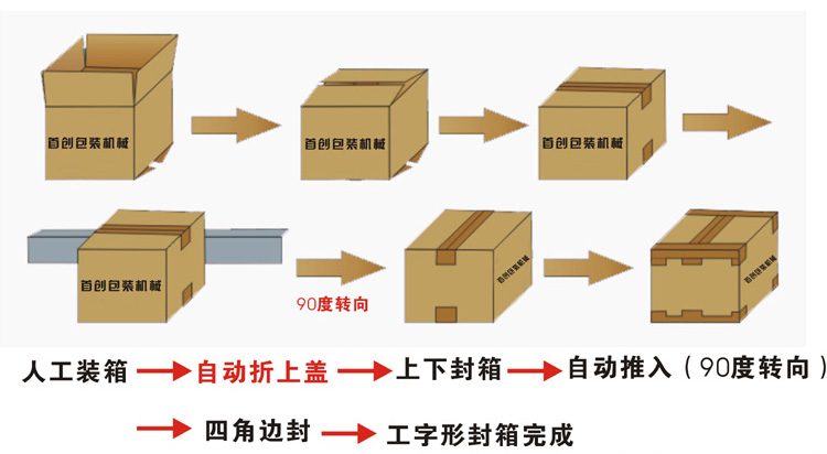 ④適用多種紙箱自動折蓋工字型封箱,紙箱上下四個角邊同時自動封口、撫平,快速、平穩,也可與自動化包裝流水線配套使用。