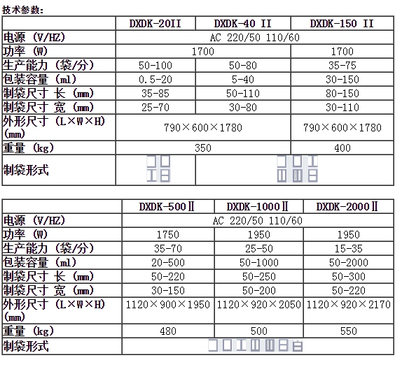 注:1.DXDK-20-150為機械拉袋不識別光標的機型;DXDK-20-150II機型為數控機型,電子拉袋識別光標.2.DXDK-500-1000機型為程序控制機型,離合器拉袋識別光標,DXDK-500-1000II機型為數控機型,電子拉袋識別光標.