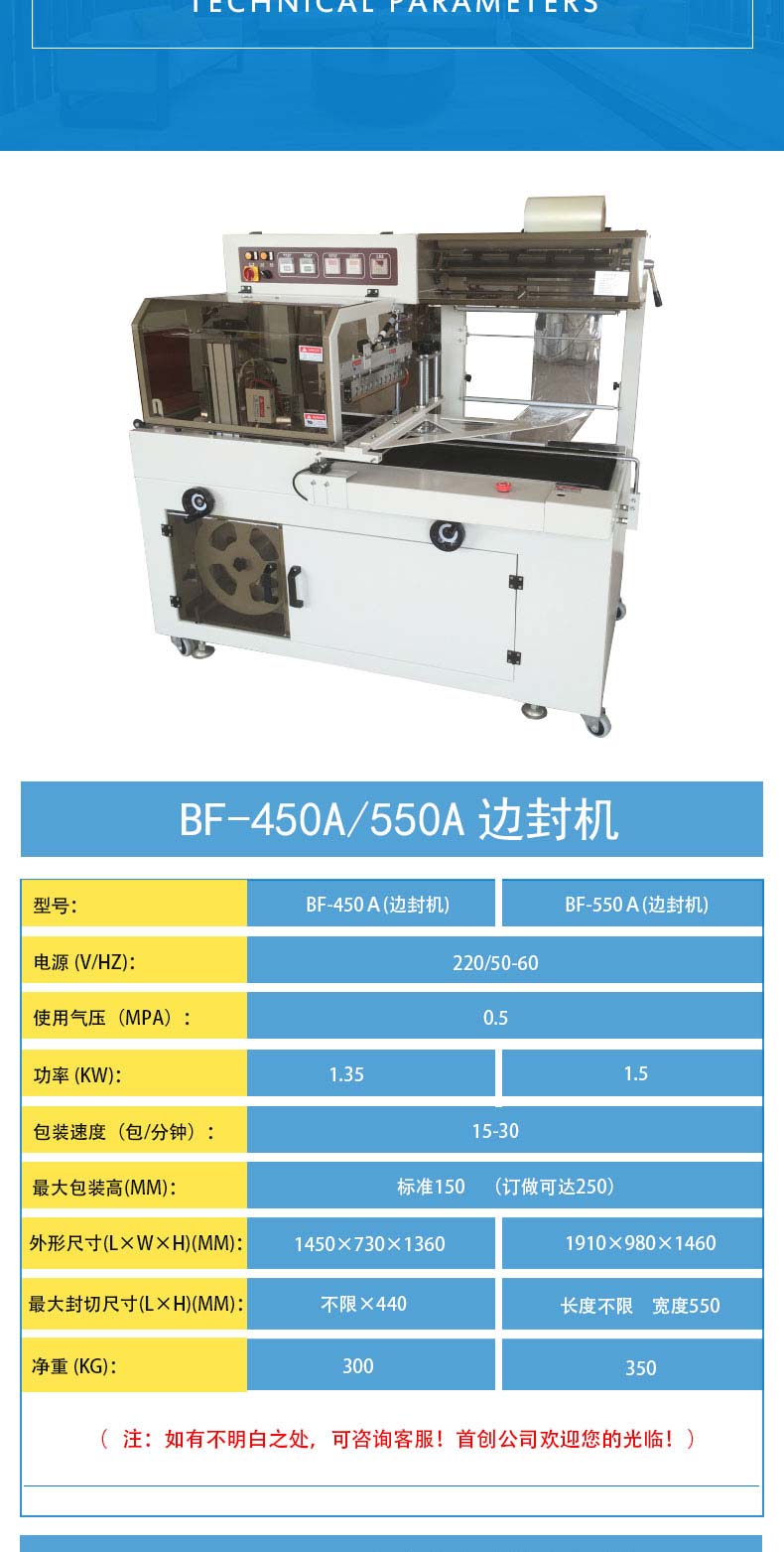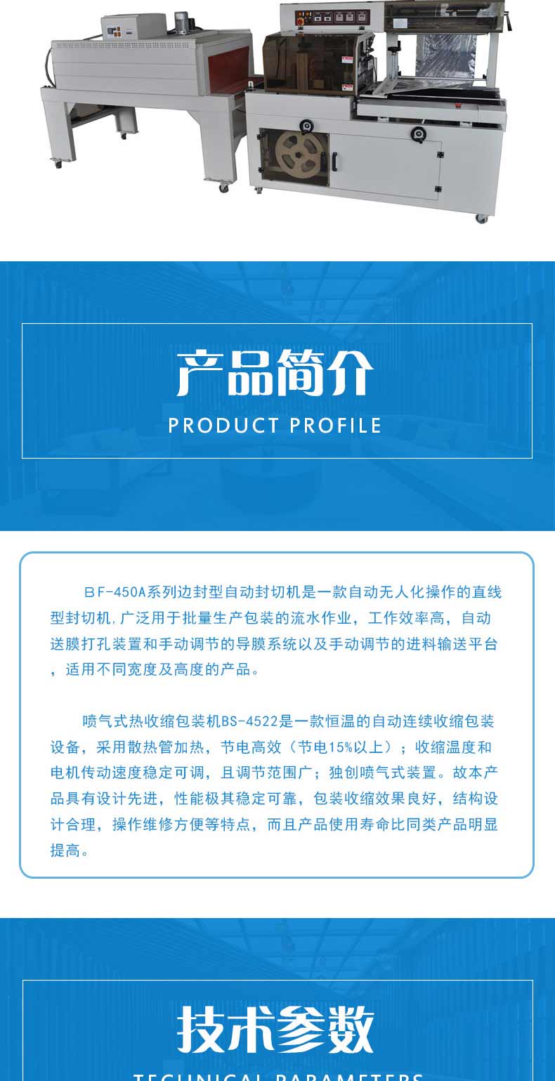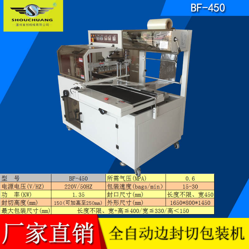 BF-450A系列邊封型全自動(dòng)封切機(jī)適用于軟件、食品、化妝品、印刷、制藥及地板、陶瓷、飲料、五金等行業(yè)的大批量收縮包裝。適用于POF膜包裝.