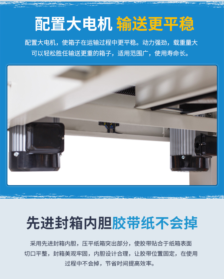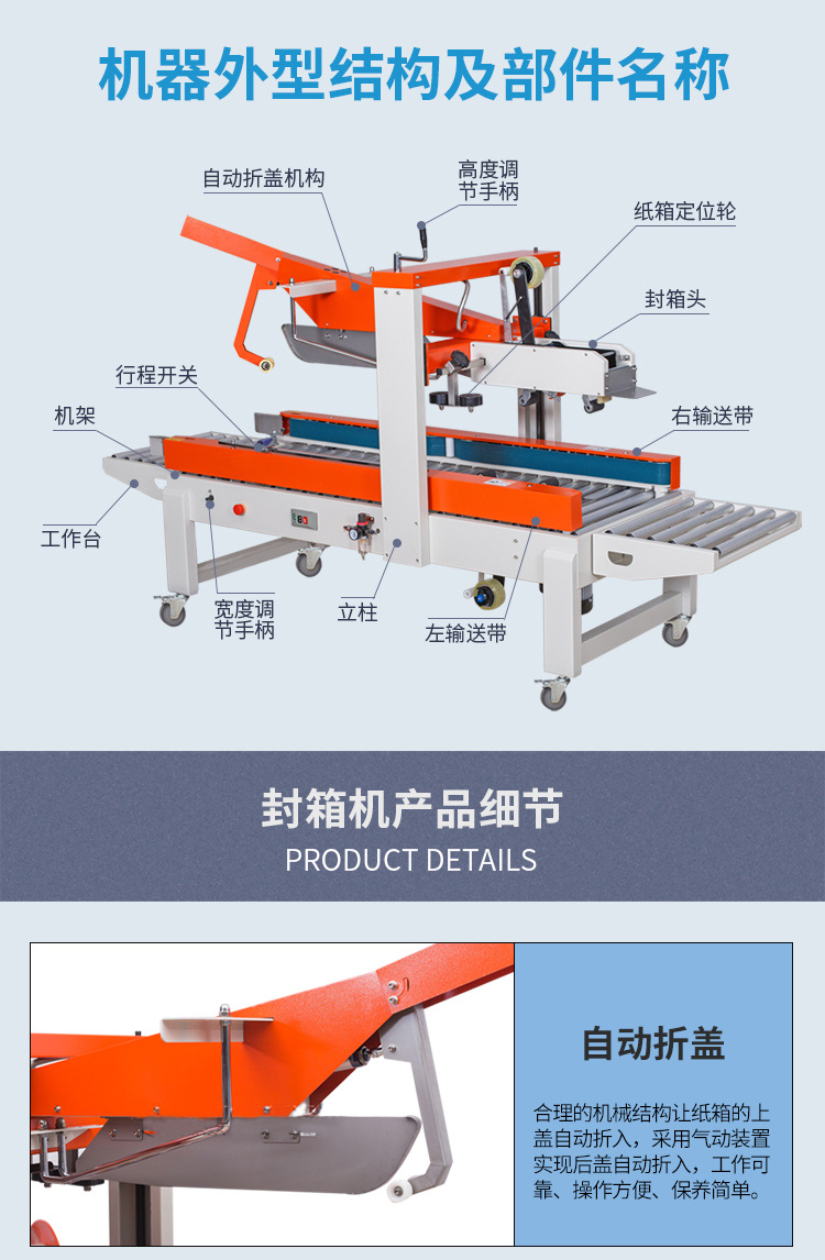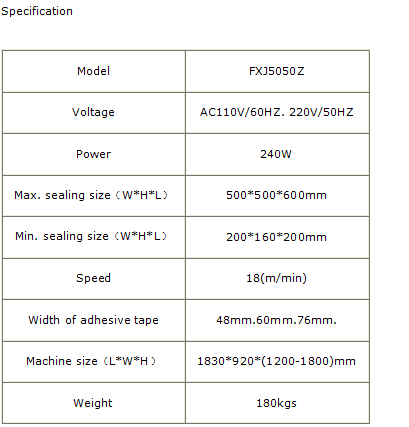 The machine is mainly useful for the sealing and packing of cartons,which can be single-unit operation or also equipped into production line.It is widely used in the fields of electrical appliance,foodstuffs,general merchandise,medicine and chemical industry.The top,side and back flap of the carton can be folded automatically,with high speed &smooth.