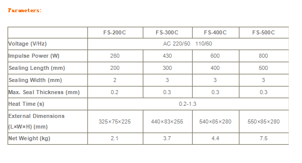 FS-C series hand impulse sealers with side cutter are widely used in such industries as foodstuff, special local products, tea, medicine, hardware etc. They are most convenient and economical sealing equipments for shops, families and factories